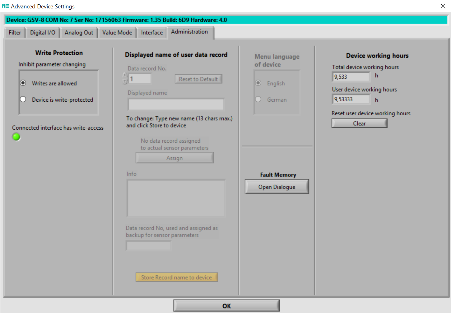 Über die Menüleiste gelangt man von "Device" --> "Advanced Settings" --> "Administration" zur Einstellung des Schreibschutzes.