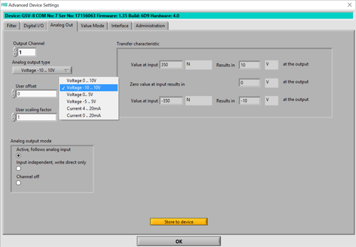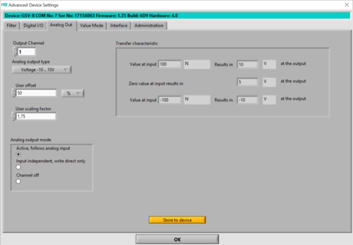 Von der Menüleiste "Device" --> "Advanced Settings" wird die Konfiguration der Analogausgänge erreicht.