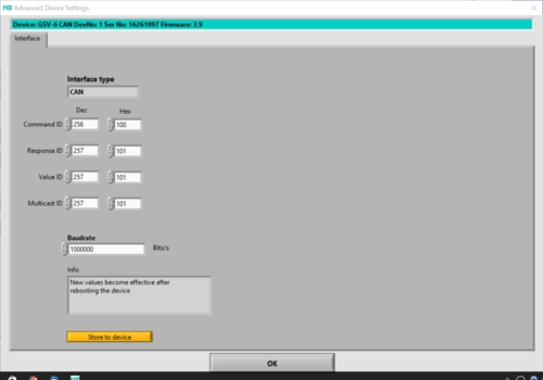 Dert CANbus des GSV-6 wird im Fenster "interface" bezüglich Adressen und baudrate konfiguriert.