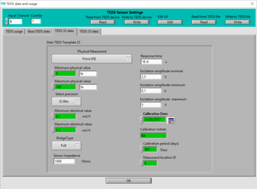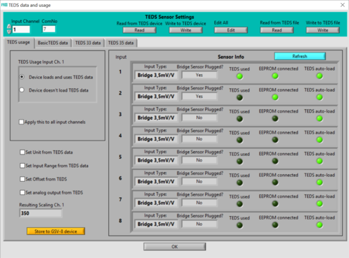Ab Version 1.38 und GSV-8 ab Firmware 1.34 werden Template 33 (2-Punkt Kalibrierung für Sensoren) und Template 35 (Dehnungsmessstreifen) sowie die Basis Einstellungen, z.B. Seriennummer und Hersteller unterstützt. Das Geräteverhalten bei der Verwendung von TEDS ist unter "TEDS usage" konfigurierbar.