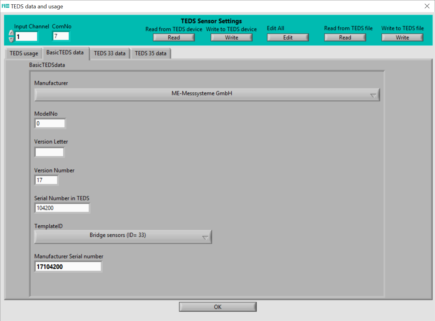 TEDS Basic Template zur Eingabe der Seriennummer und des Herstellers