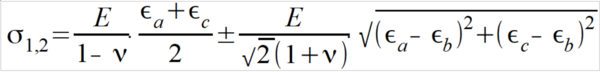 If the stress state is biaxial, the principal stresses and the direction of the principal stresses must be determined. Three determination equations are required to determine the three unknown quantities. Therefore, three measuring grids are used in three linearly independent directions, e.g. 0°, 45° and 90° or 0°, 60° and 120°.