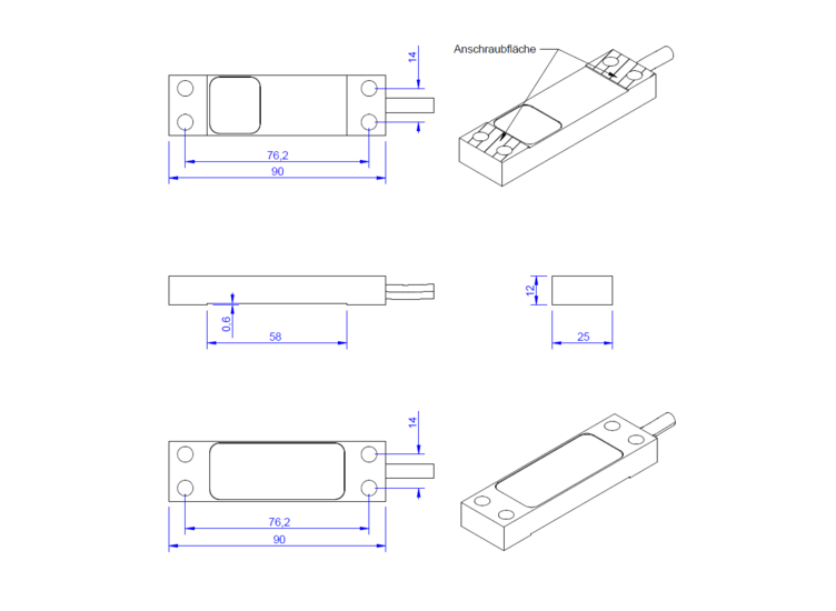 The transducer is installed by screwing it on with 4 M6 screws. Areas of application include force monitoring, level measurement and strain measurement on steel components. Mechanical loads on the component are transferred to the strain transducer by means of frictional connection via the 4 fastening screws and converted into an electrical output signal.