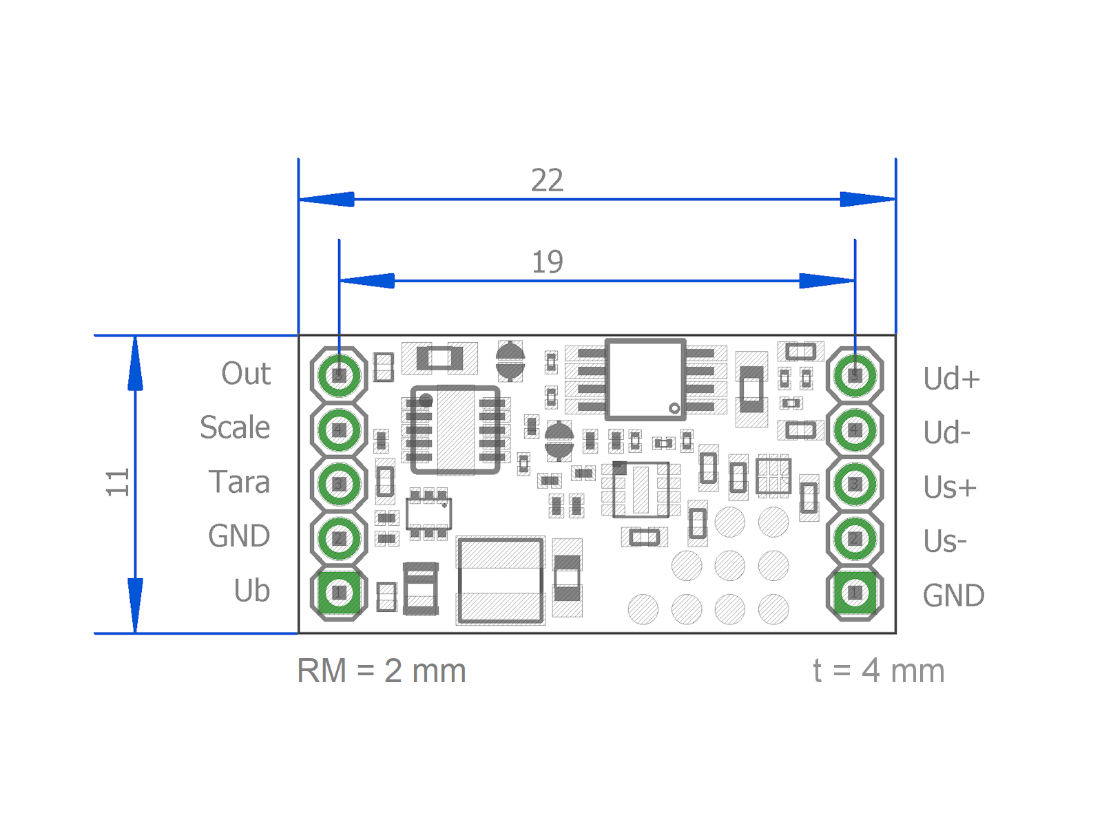 The measuring amplifier is characterized by very small dimensions of only 22 mm in length and 4 mm in thickness. The fixing can be done with the help of 2 fixing straps and M2 screws.