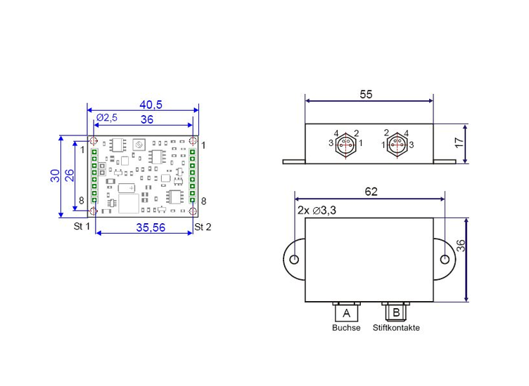The module GSV-1M is a encapsulated version of the printed circuit board GSV-1L with miniature M8 connectors.