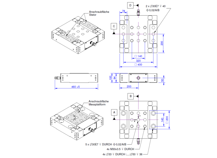 The 3-axis sensor K3D400 is suitable for measuring force in three perpendicular axes. Force is applied onto the 200mm x 200mm platform. A test-specimen can be installed on this surface with four M30 screws. The bottom of the sensor is fixed to the bottom with four M30 screws. The screw-mounting surfaces must end flush with the sensor.