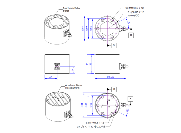 • mounting and centering: 6 x female thread M10x1,5; 2 drill hole Ø6 mm H7
