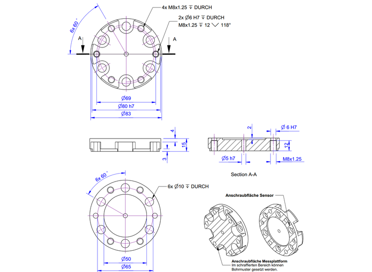 Adapter plate for multicomponent sensor K6D68 from 5kN made of stainless steel 1.4542 for mounting of attached parts and for homogeneous load distribution.