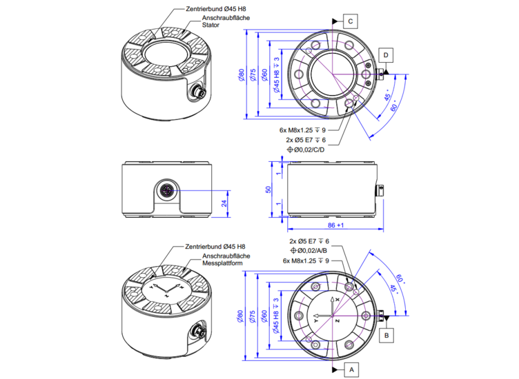 The sensor K6D80 2kN/100Nm is made of aluminium alloy, the sensor K6D80 5kN/250Nm is made of high-strength stainless steel 1.4542.