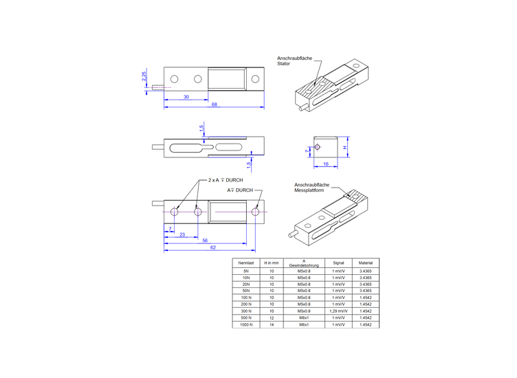 There is a thread M6 for force transmission, which is displaced parallel under loading. The force sensor tolerates displacements of force transmission and lateral forces due to its design as a double-beam.