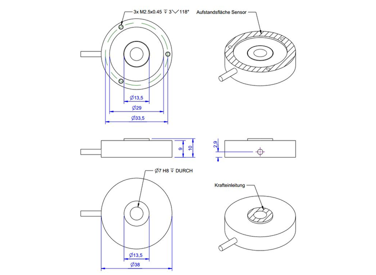 But the through hole 7mm is also suitable for introduction of a force transmission. With a spherical cap the force transmission can be centered and made free of lateral force .