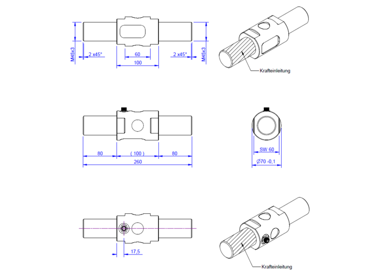 The KM70z force sensor is a tension/compression force sensor with compact dimensions. Two M45x3 coarse-feeding threads are provided for application of force.