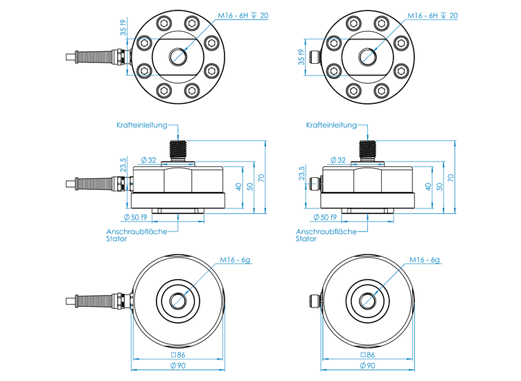 • a central M16 external thread for force introduction for the 2 kN and 5 kN variants