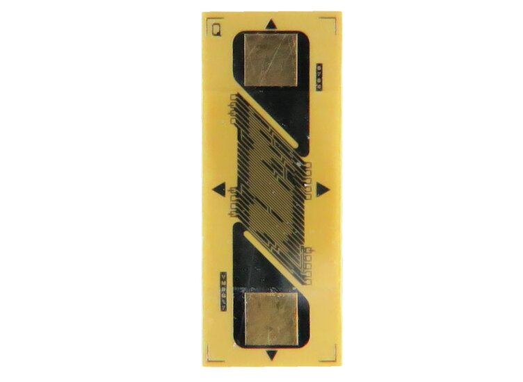 Ultra-miniature strain gauge is applicable for the construction of load pins and shear force sensors. The complementary type with -45° orientation is S5276. The backing material of this strain gauge is a polyimide with about 20μm thickness. The Karma measuring grid (3 μm) is covered with polyimide film, also with a thickness of approx. 20μm. The contact surfaces are gold-plated for easy connection of the Cu enameled wires or Teflon strands AWG44 ... AWG36. This strain gauge of the N5K series is suitable for use in the temperature range from -76 ° C to + 205 ° C.