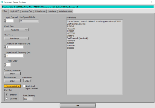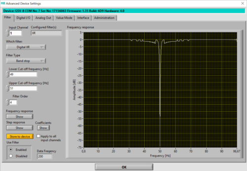 The configuration of various filters is achieved from the menu bar "Device" --> "Advanced Settings", including analog input filter, optional digital filter and average filter (device dependent).