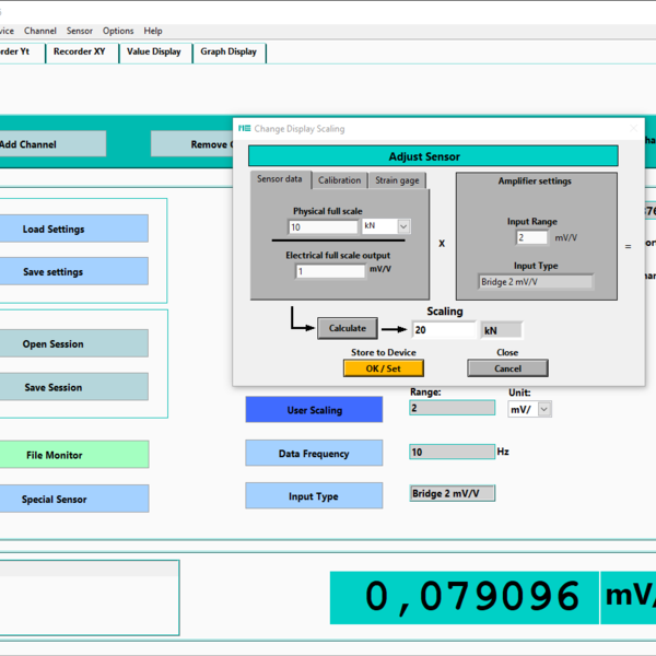 The measuring amplifier converts the differential signal Ud of the Wheatstone bridge into a digital signal. It provides the required supply voltage Us for the sensor's Wheatstone bridge. The input measuring range MR for the voltage ratio Ud/Us is usually fixed to, for example, 2.0000 mV/V or 3.5000 mV/V, or can be adjusted in specific steps using a jumper or configuration software. The input measuring range MR is usually specified on the measuring amplifier's nameplate.