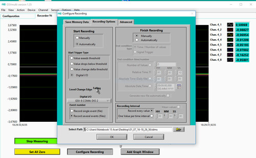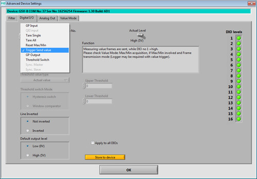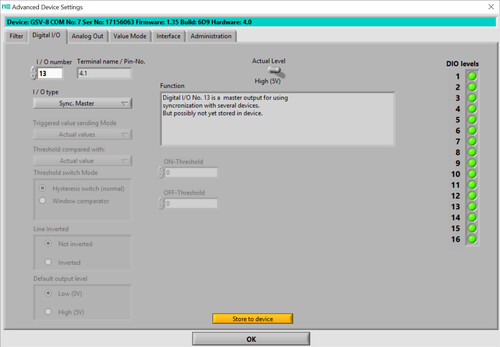 In this case, synchronization between two or more devices is achieved via digital inputs and outputs: The measuring amplifier, which is configured as the "master", accompanies each measured value with an edge at the digital output.