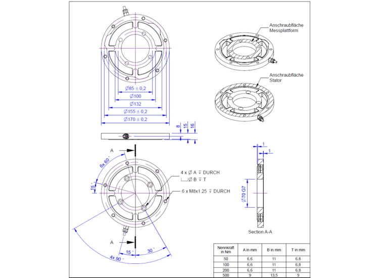 The torque sensor comprises an external flange and an inner flange, which are inter-connected via 4 torque axle brackets. The outer and inner flange have 6 or 4 M8 screw threads respectively to apply torque.