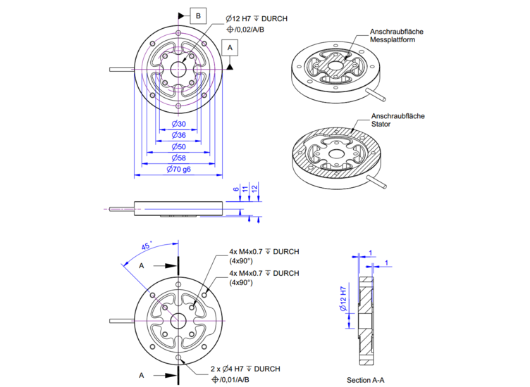 4 shear beams. Outer and inner flange have 4 threads M4 each for torque introduction.