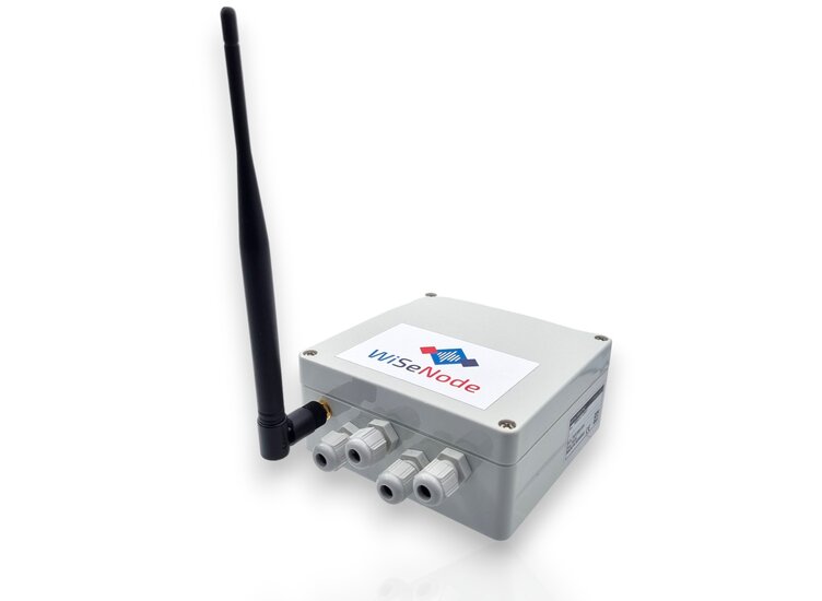 The LoRaWAN end device (node) WiSeNode is a 4-channel data logger with a radio interface to a LoRaWAN gateway, which stores the measurement data on a remote server (in the cloud) wirelessly via LTE or wired via LAN interface.